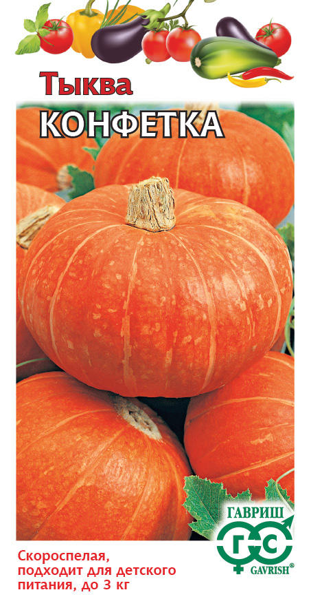 Тыква КонфеткаСкороспелый (85-95 дней от всходов до созревания) сорт. Плетистое растение одновременно формирует до 6 хорошо сегментированных плодов округлой формы, массой 1,5-3,0 кг. Окраска коры при созревании ярко-красная. Мякоть красно-оранжевая, хрустящая, сладкая, сочная. Вкус отличный. Обладает качествами пригодными для переработки и потребления в свежем виде. Используется при изготовлении пюре для детского питания. Выращивается как рассадным способом, так и прямым посевом в грунт. Глубина заделки 4-10 см, в зависимости от почвы. Хорошо отзывается на внесение органических удобрений. Собирают тыкву обязательно с плодоножками. Главное условие для успешного хранения – сухой воздух, проветриваемое помещение.