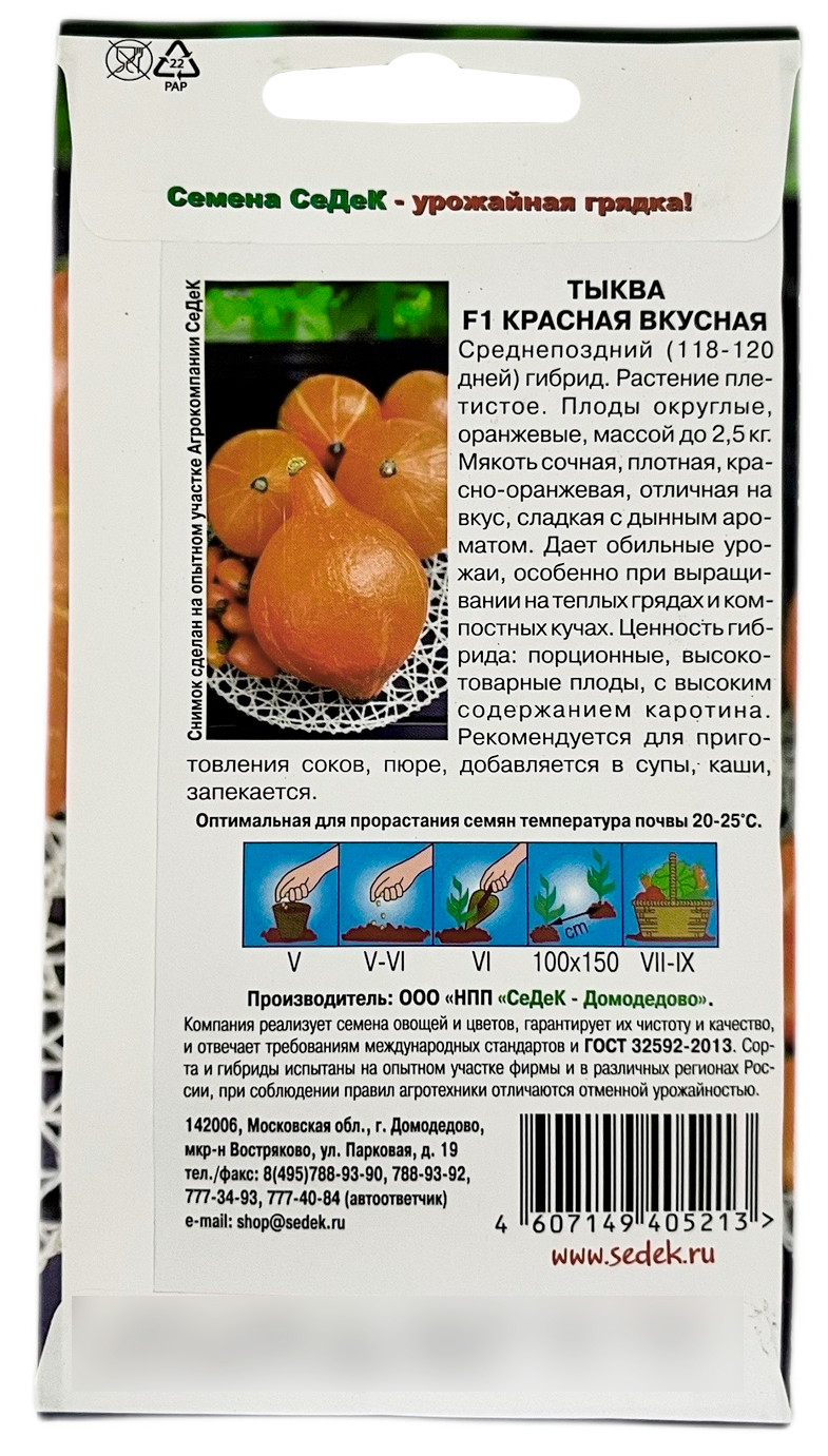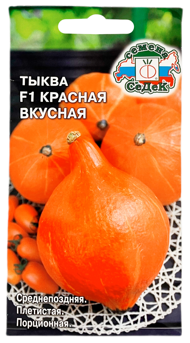 Тыква Красная Вкусная СеДеКСреднепоздний (118-120 дней) сорт. Растение плетистое. Плоды округлые, оранжевые, массой до 2,5 кг. Мякоть сочная, плотная, красно-оранжевая, отличная на вкус, с дынным ароматом. Дает обильные урожаи особенно при выращивании на теплых грядах и компостных кучах. Ценность сорта: порционные, высокотоварные плоды, с высоким содержание каротина.