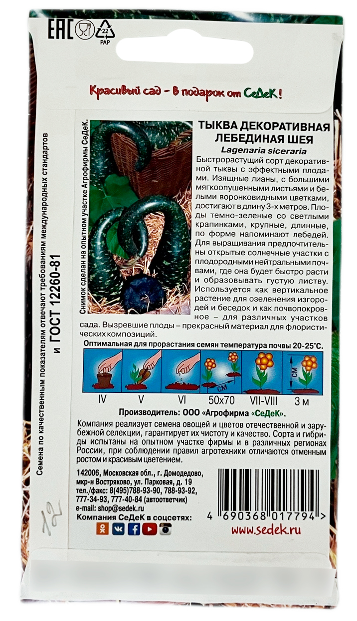 Тыква декоративная ЛЕБЕДИНАЯ ШЕЯ ГАВРИШБыстрорастущее неприхотливое растение, способное «вскарабкаться» на высоту до 3-х м, благодаря расположенным на лиане усикам. Стебель травянистый с большими белыми воронковидными цветками. Плоды, массой 0,2-0,6 кг, имеют оригинальную корончатую форму и заслуживают восхищения за огромное разнообразие всевозможных окрасок оранжевого, зеленого, белого и желтого цвета. Растение предпочитает солнечные, защищенные от ветра места с плодородной, слабокислой почвой. Применяется как для вертикального украшения балконов, стен, беседок и как почвопокровное растение для различных участков сада. Хорошо вызревшие плоды долго сохраняют свою декоративность. Оптимальная для прорастания семян температура почвы 20-25°С.