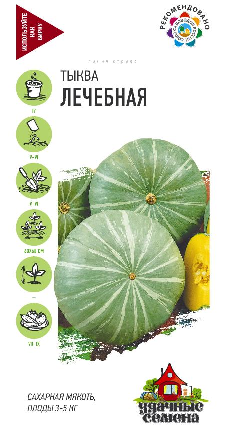 Тыква ЛечебнаяРаннеспелый (100-105 дней от всходов до плодоношения) сорт столового назначения. Растение компактное, короткоплетистое. Плоды округло-сплюснутые, слабосегментированные, светло-серой окраски, рисунок с короткими прерывистыми полосами. Масса плода 3,0-5,5 кг. Кора тонкая, кожистая. Мякоть светло-оранжевая, толстая, хрустящая, сладкая, сочная, с высоким содержанием каротина. Сорт урожайный, высокой товарности, вкусовые качества отличные. Может храниться до мая месяца. Выращивается как рассадным способом, так и прямым посевом в грунт. Посев на рассаду в апреле, высадка в грунт в мае – июне. Посев непосредственно в грунт в конце мая – июне. Хорошо отзывается на внесение органических удобрений. Схема посадки 80х80 см. Урожайность до 30,0 кг/м2.
