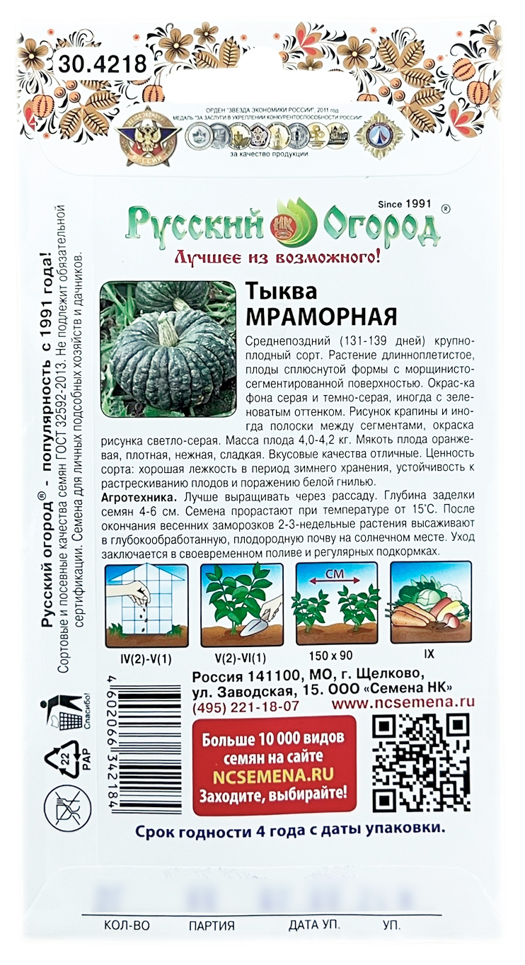 Тыква МРАМОРНАЯ Русский ОгородСамая популярная тыква среди тёмнокорых. Цвет спелой тыквы от тёмно-зелёного до серого с мраморными разводами или крапом. Однако любовь к этому сорту вызвана не цветом плода, а великолепными вкусовыми качествами. Это самый сладкий сорт у которого съедобна и вкусна даже кора (в запечённом виде). Знатоки говорят, что мякоть этой тыквы вкуснее, чем у моркови, ведь в ней до 12% сахара (против 3-5% у остальных сортов).