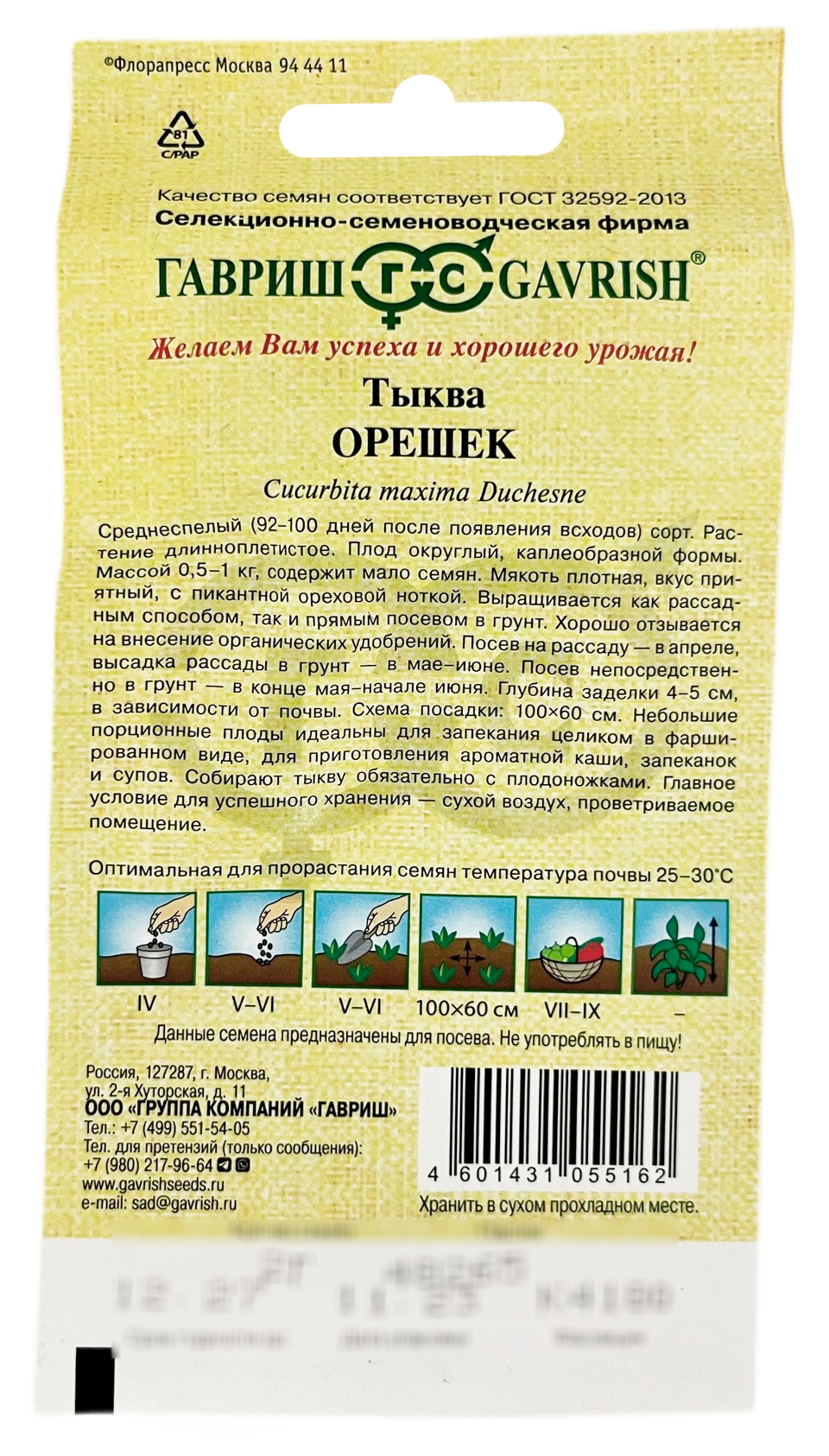 Тыква ОРЕШЕК ГАВРИШСреднеспелый (92–100 дней после появления всходов) сорт. Растение длинноплетистое. Плод округлый, каплеобразной формы. Массой 0,5–1 кг, содержит мало семян. Мякоть плотная, вкус приятный, с пикантной ореховой ноткой.