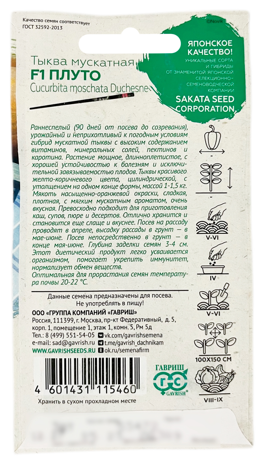 Тыква Плуто, мускатная F1 ГАВРИШРаннеспелый (90 дней от посева до созревания) урожайный и неприхотливый к погодным условиям гибрид мускатной тыквы с высоким содержанием витаминов, минеральных солей, пектинов и каротина.Растение мощное, длинноплетистое, с хорошей устойчивостью к болезням и исключительной завязываемостью плодов.Тыквы красивого желто-коричневого цвета, цилиндрической с утолщением на одном конце формы, массой 1-1,5 кг.Мякоть насыщенно-оранжевой окраски, сладкая, плотная, с мягким мускатным ароматом и очень вкусная.Превосходно подходит для приготовления каш, супов, пюре и десертов. Отлично хранится и становится еще слаще и вкуснее.Посев на рассаду проводят в апреле, высадку рассады в грунт - в мае-июне.Посев непосредственно в грунт- в конце мая-июне. Глубина заделки семян 3-4 см.Этот диетический продукт легко усваивается организмом, помогает укрепить иммунитет,нормализует обмен веществ.