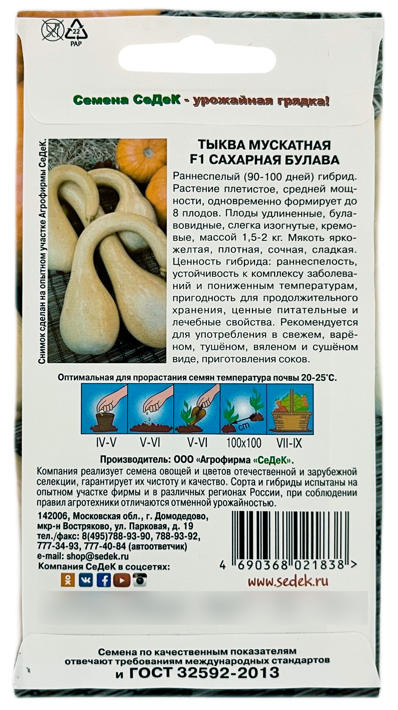Тыква Сахарная Булава F1 СеДеКРаннеспелый (90-100 дней) сорт. Растение плетистое, средней мощности, одновременно формирует до 8 плодов. Плоды удлиненные, булавовидные, слегка изогнутые, кремовые, массой 1,5-2 кг. Мякоть ярко-желтая, плотная, сочная, сладкая. Ценность сорта: раннеспелость, устойчивость к комплексу заболеваний и пониженным температурам, пригодность для продолжительного хранения, ценные питательные и лечебные свойства. Рекомендуется для употребления в свежем, варёном, тушёном, вяленом и сушёном виде, приготовления соков.