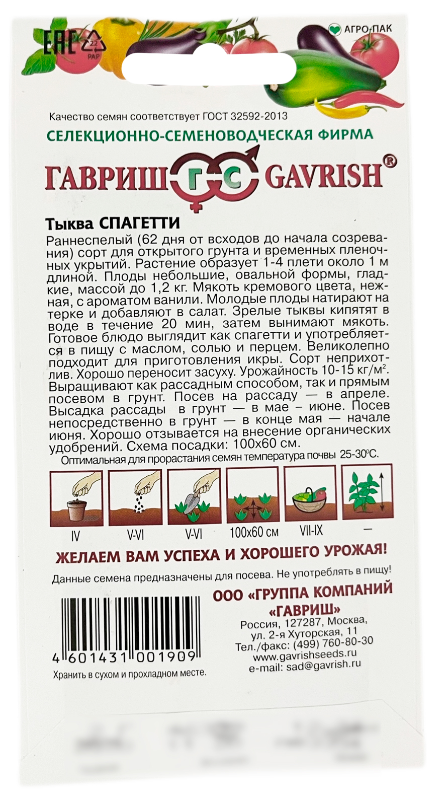 Тыква Спагетти ГАВРИШРаннеспелый (62 дня от всходрв до созревания) сорт для открытого грунта и временных пленочных укрытий. Выращивается как рассадным способом, так и прямым посевом в грунт. Посев на рассаду в апреле, высадка в грунт в мае – июне. Посев непосредственно в грунт в конце мая - июня. Хорошо отзывается на внесение органических удобрений. Неприхотлив. Хорошо переносит засуху. Растение образует 1-4 плети около 1 м длиной. Плоды бочковидной формы, длиной до 30 см, массой 0,85 кг. Молодые плоды свежими режит в салат. Зрелые кабачки кипятят в воде в течение 20 мин, затем вынимают мякоть. Мякоть бежевая с ароматом ванили. Готовое блюдо выглядет как спагетти и употребляется в пищу с маслом, солью и перцем. Великолепно подходит для приготовления икры. Схема посадки 60 на 60 см.Урожайность 10-15 кг/м2.
