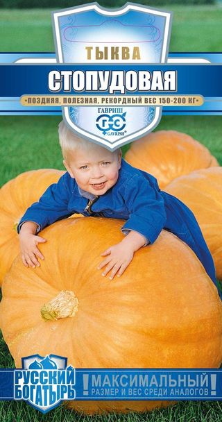Тыква Стопудовая 1,0 г серия Русский богатырьПозднеспелый (от полных всходов до сбора плодов 125-140 дней) сорт гигантской тыквы. Растение мощное. Плод неправильной округлой формы, сегментированный, серо-желтого цвета, средней массой 10-20 кг. При выращивании на плодородной почве и хорошем уходе отдельные плоды этого сорта достигают рекордных размеров 150-200 кг. Кора толстая, кожистая. Мякоть ярко-желтая, плотная, очень вкусная и полезная. Великолепно подойдет для приготовления каш, пирогов, десертов и запекания. Сорт устойчив к основным заболеваниям тыквенных культур. Отлично хранится. Посев на рассаду - в апреле, высадка рассады в грунт - в мае, июне. Посев непосредственно в грунт - в конце мая, июня. Глубина заделки 3-4 см. Схема посадки: 100х150 см.