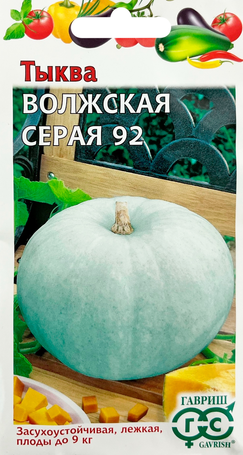 Тыква Волжская серая 92Среднеспелый (102-121 день от полных всходов до уборки) сорт. Растение длинноплетистое (до 8 м), мощное, с крупными почковидными листьями. Плод слабо - или среднесплюснутый, слабосегментированный или гладкий, массой 6,3-9,0 кг. Окраска светло-серая и зеленовато-серая, без рисунка. Кора упругая, кожистая. Мякоть желтой и кремовой окраски, толщиной 4-4,5 см, средней плотности, сладкая. Вкусовые качества хорошие. Выращивается рассадным способом и прямым посевом в грунт. Посев на рассаду в апреле, высадка в грунт в мае – июне по схеме 60 x 60 см. Посев непосредственно в грунт в конце мая – июне. Хорошо отзывается на внесение органических удобрений. Урожайность 15 кг/м2.