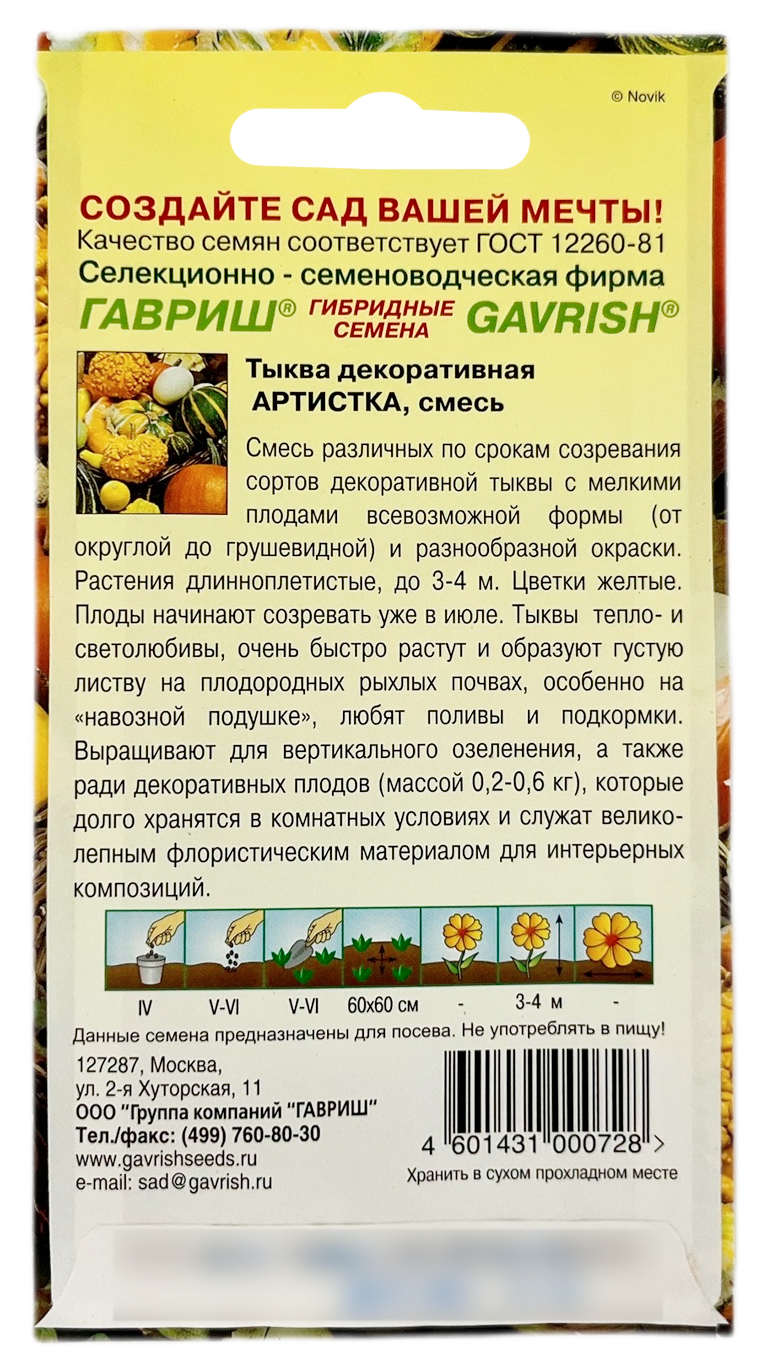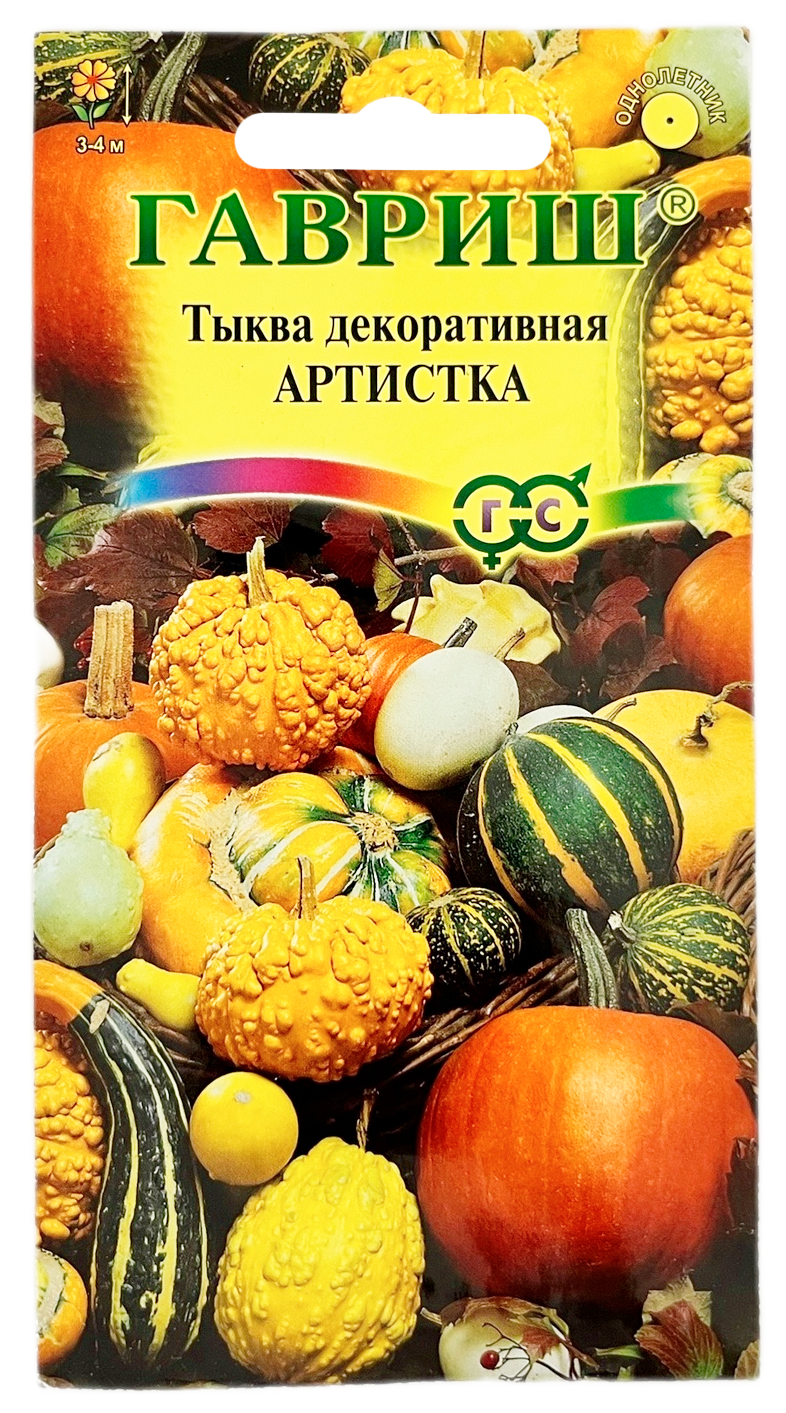 Тыква декоративная АРТИСТКА смесь ГАВРИШСмесь различных по срокам созревания сортов тыквы декоративной с мелкими плодами всевозможной формы (от округлой до грушевидной) и разнообразной окраски. Растения длинноплетистые, до 3-4 м. Цветки желтые. Плоды начинают созревать уже в июле. Тыквы тепло- и светолюбивы, очень быстро растут и образуют густую листву на плодородных рыхлых почвах, особенно на «навозной подушке», любят поливы и подкормки. Выращиваются для вертикального озеленения, а также ради декоративных плодов (массой 0,2 – 0,6 кг), которые долго хранятся в комнатных условиях и служат великолепным флористическим материалом для интерьерных композиций.