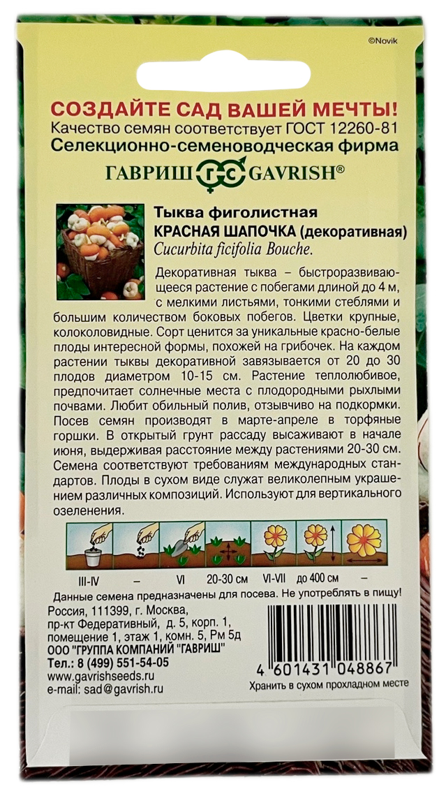 Тыква декоративная КРАСНАЯ ШАПОЧКА ГАВРИШДекоративная тыква – быстроразвивающееся растение с побегами длиной до 4 м. С мелкими листьями, тонкими стеблями и большим количеством боковых побегов. Цветки крупные, колоколовидные. Сорт ценится за уникальные красно-белые плоды интересной формы похежей на грибочек. На каждом растении тыквы декоративной завязывается от 20 до 30 плодов, диаметром 10-15 см. Растение теплолюбивое, предпочитает солнечные места с плодородными, рыхлыми почвами. Любит обильный полив, отзывчиво на подкормки. Посев семян производят в марте - апреле в торфяные горшки. В открытый грунт рассаду высаживают в начале июня, выдерживая расстояние между растениями 20-30 см. Семена соответствуют требованиям международных стандартов. Плоды в сухом виде служат великолепным украшением различных композиций. Используют для вертикального озеленения.