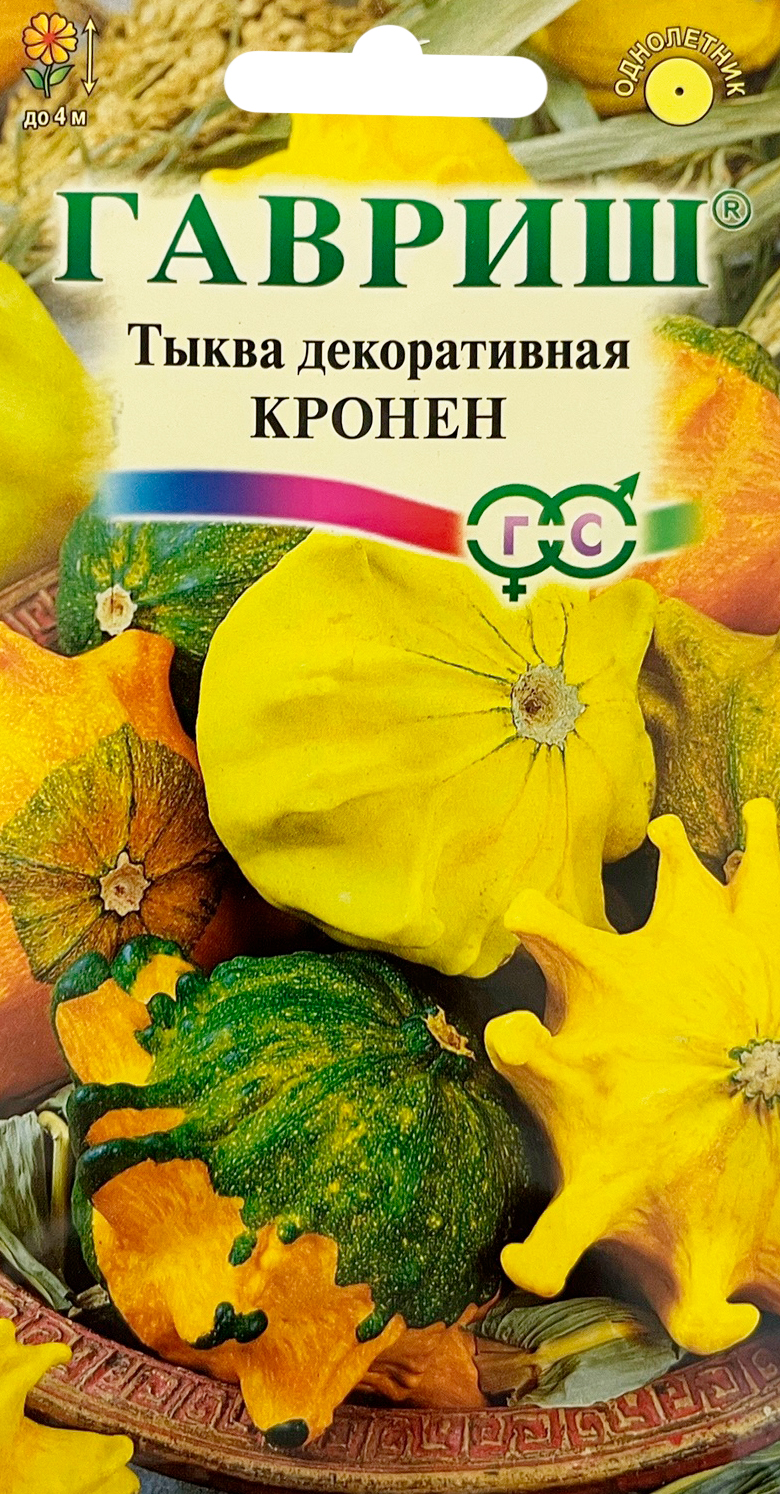 Тыква фиголистная декоративная КРОНЕН смесь ГАВРИШСмесь Кронен - оригинальные однолетние неприхотливые растения с изумрудными листьями, желтыми цветками и разноцветными плодами необычной корончатой и зонтиковидной формы. Изящные лианы легко «вскарабкаются» на высоту до 4 м, украсив арку, беседку, забор или стену дома, а созревшие плоды станут интересным флористическим материалом для интерьерных композиций. Тыквенные культуры тепло- и светолюбивы, очень быстро растут и образуют густую листву на плодородных рыхлых почвах, особенно на «навозной подушке», любят поливы и подкормки. Плоды начинают созревать уже в июле. Для флористических целей пригодны только хорошо вызревшие плоды.