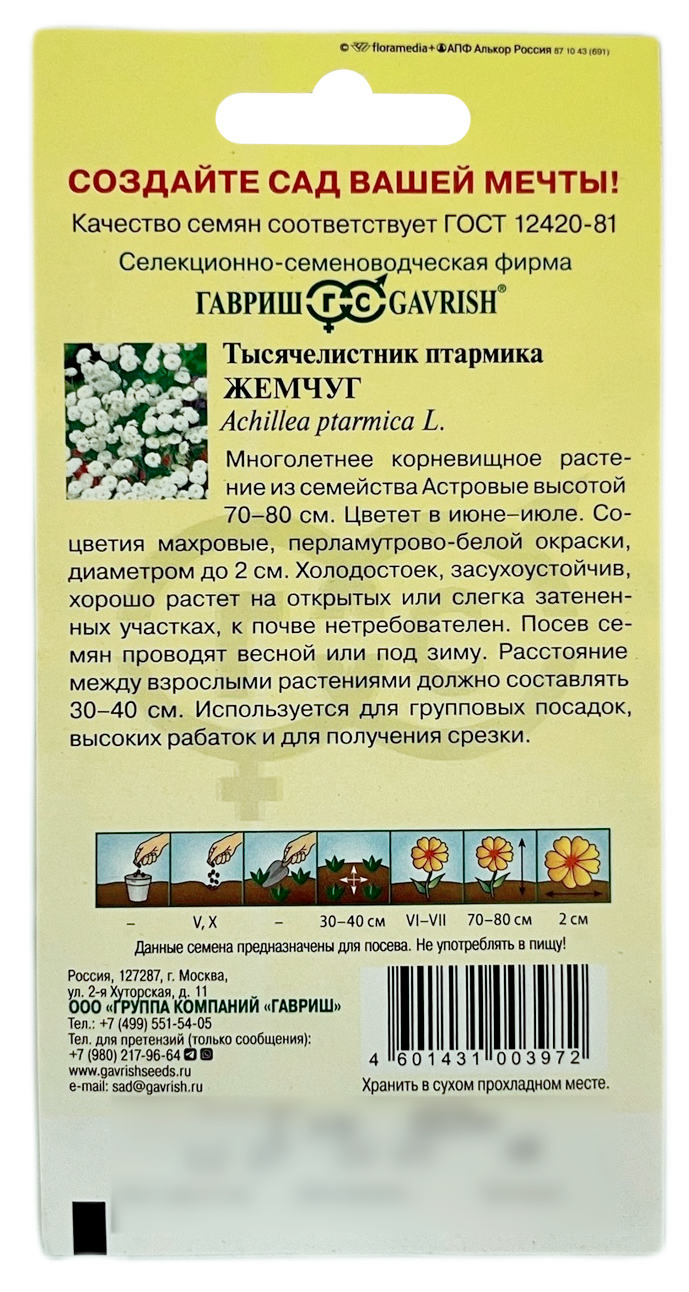 Тысячилистник птармика ЖЕМЧУГ ГАВРИШМноголетнее корневищное растение из семейства Астровых высотой 70-80 см. Цветет в июне-июле. Соцветия махровые, перламутрово-белой окраски, диаметром до 2 см. Холодостоек, засухоустойчив, хорошо растет на открытых или слегка затененных участках, к почве нетребователен. Посев семян проводят весной или под зиму. Расстояние между взрослыми растениями должно составлять 30-40 см. Используется для групповых посадок, высоких рабаток и для получения срезки.