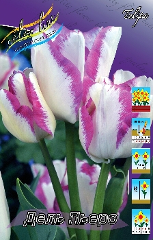 Тюльпан Дель Пьеро относится к группе Многоцветковые, высота растения 50 см, цветки имеют бокаловидные бутоны с немного заостренными лепестками, высота бокалов 6-8 см. Окрас цветка белый с малиново-розовыми краями. Посадка - август, сентябрь, октябрь. Глубина посадки зависит от размера луковицы и составляет в среднем 8-12 см. Минимальное расстояние между луковицами должно вдвое превышать их диаметр. Период цветения: конец апреля - начало мая. Почва нужна плодородная, рыхлая, хорошо дренированная, умеренно увлажненная с нейтральной или щелочной реакцией. Сорт универсального назначения. Сфера использования - подходит как для озеленения и украшения клумб, так и для букетов, отлично растет на хорошо освещенном месте и в полутени. Элегантный букет на одном стебле.Характеристики