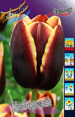 Тюльпан Доберман относится к группе Триумф, высота растения до 50 см, цветок бокаловидный, крупный. Окраска цветка бронзово-бордовая с темно-желтым краем, высота бокала цветка до 10 см. Посадка - август, сентябрь, октябрь. Глубина посадки зависит от размера луковицы и составляет в среднем 8-12 см. Минимальное расстояние между луковицами должно вдвое превышать их диаметр. Период цветения - апрель - май. Почва - нейтральная или известково - кислая. Тюльпан Доберман универсален, используется для выгонки, для украшения парков и садов. Цветет довольно продолжительное время и хорошо сохраняет форму бокала. Недостатком является слабая сопротивляемость вирусу пестролепестностиХарактеристики