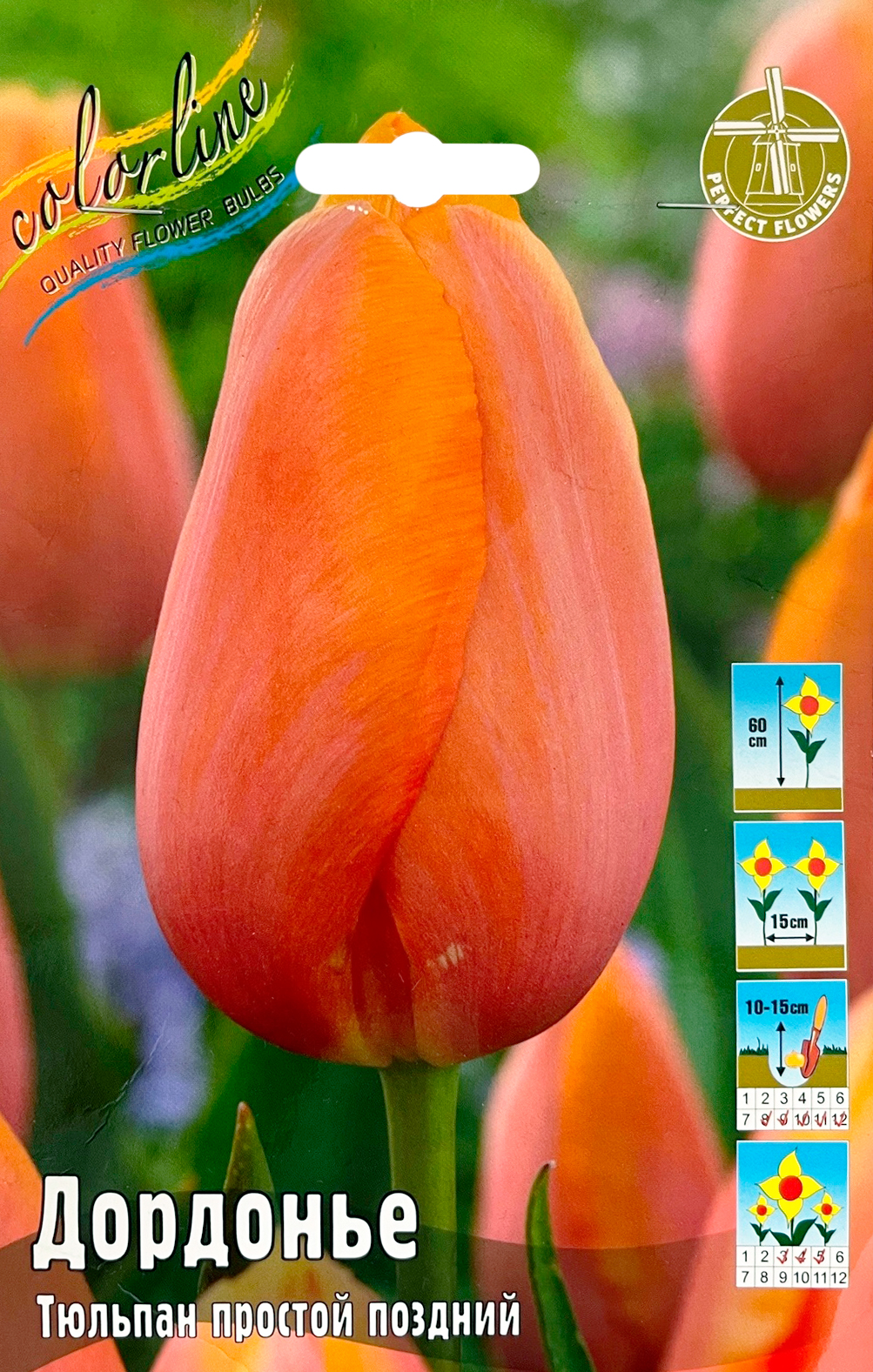 Тюльпан ДордоньеРазмер луковицы 11-12 см Тюльпан Дордогне (Dordogne) . Класс - Триумф Тюльпан Дордогне отлично подходит этот сорт для новичков, благодаря своей неприхотливости. Период цветения тюльпана Дордогне приходится на апрель, образуя крупные бутоны, классической формой бокала высотой 8-9 см. Оттенок лепестков переходит от нежно-розового с абрикосово-оранжевой каймой по краям. Диаметр цветка 10-15 см с дивным сладким ароматом. Продолжительность цветения одного бутона 8-10 дней. Благодаря большому количеству бутонов, тюльпаны этого сорта длительное время украшают клумбу привлекая взгляд. Высота очаровательного тюльпана Dordogne достигает 40-60 см с темно-зелеными прикорневыми листьями сизого оттенка.
