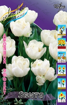 Тюльпан Эвита относится к группе супер-тюльпанов "Двойной Эффект". Цветок имеет пышный бутон, который слабо пахнет, многоцветковый, махровый. Высота растения достигает 45 см. Окраска: белый. Посадка август, сентябрь, октябрь. Глубина посадки зависит от размера луковицы и составляет в среднем 8-10 см. Минимальное расстояние между луковицами должно вдвое превышать их диаметр. Период цветения - апрель-май. Почва - плодородные, рыхлые, умеренно увлажненные с нейтральной или щелочной реакцией. Место для их посадки в солнечном месте и защищен от ветра. Сфера использования - ландшафтный дизайн, домашние декорации, для озеленения, на срезку.Характеристики