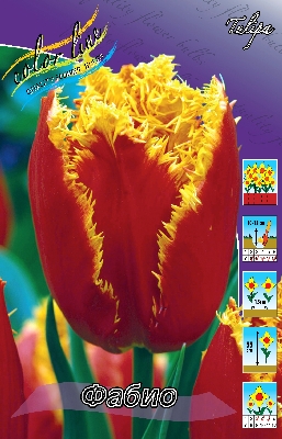 Тюльпан Фабио относится к группе Бахромчатые. Высота растения до 55 см. Цветок бокаловидный, крупный. Окрас цветка: темно-красный с белым основанием, высота бокала цветка 7-9 см. Бахрома густая, длинная, жёлтого цвета. Посадка - август, сентябрь, октябрь. Глубина посадки зависит от размера луковицы и составляет в среднем 8 - 12 см. Минимальное расстояние между луковицами должно вдвое превышать их диаметр. Период цветения - апрель - май. Почва - нейтральная или известково - кислая. Сорт универсального назначения. Сфера использования - ландшафтный дизайн, домашние декорации.Характеристики