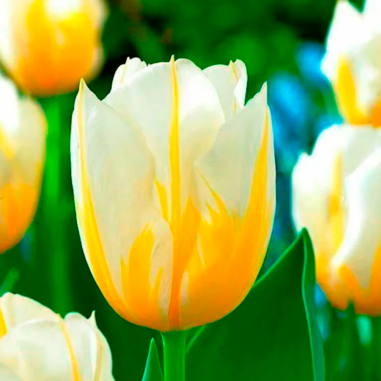 Тюльпан Флэминг КокеттТюльпан Flaming Coquette относится к сортам тюльпанов группы Триумф (класс Т). Цветет тюльпан в апреле-мае, образуя шикарный яркий цветок бело-желтого, пестроокрашенного цвета с высоким бокалом, до 10 см. Обладает тюльпан Flaming Coquette средней скоростью роста, подходит как для озеленения и украшения клумб, так и для букетов, отлично растет на хорошо освещенном месте и в полутени. Красивый бело-желтый цветок тюльпана возвышается на прочной ноге, высотой до 45 см.