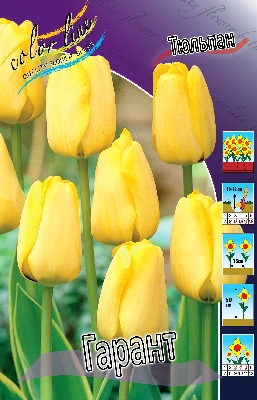 Тюльпан Гарант относится к группе Дарвиновские гибриды. Высота растения 50 см. Окрас цветка жёлтый с декоративной листвой, по краю желтая кайма, высота бокала цветка 7-9 см. Посадка - август, сентябрь, октябрь. Глубина посадки зависит от размера луковицы и составляет в среднем 8 - 10 см. Минимальное расстояние между луковицами должно вдвое превышать их диаметр. Тюльпан Гарант относится к среднепоздним. Почва - нейтральная или известково - кислая. По освещённости данные тюльпаны предпочитают безветренные солнечные места или полутень. Преимущества тюльпанов данной группы - цветы хорошо переносят весенние заморозки, устойчивы к вирусу пестролепестности, длительное время сохраняются в срезке. Кстати, срезка тюльпанов этого класса отличается высоким качеством. Отлично смотрятся в букетах!Характеристики