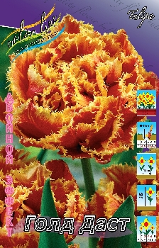 Тюльпан Голд Даст относится к группе супер-тюльпанов "Двойной Эффект". Цветок махровый и одновременно бахромчатый, каждый лепесток покрыт игольчатой бахромой. Высота растения достигает 50 см. Окраска: винно-красный, с желтой бахромой, махрово- бахромчатый. Высота бокала 5-7 см, диаметр 10-12 см. Посадка август, сентябрь, октябрь. Глубина посадки зависит от размера луковицы и составляет в среднем 8-10 см. Минимальное расстояние между луковицами должно вдвое превышать их диаметр. Период цветения - апрель-май. Почва - нейтральная или известково-кислая. Сорт идеален для выращивания в открытом грунте в солнечном месте и защищенном от ветра. Сфера использования - ландшафтный дизайн, домашние декорации, для озеленения, на срезку.Характеристики