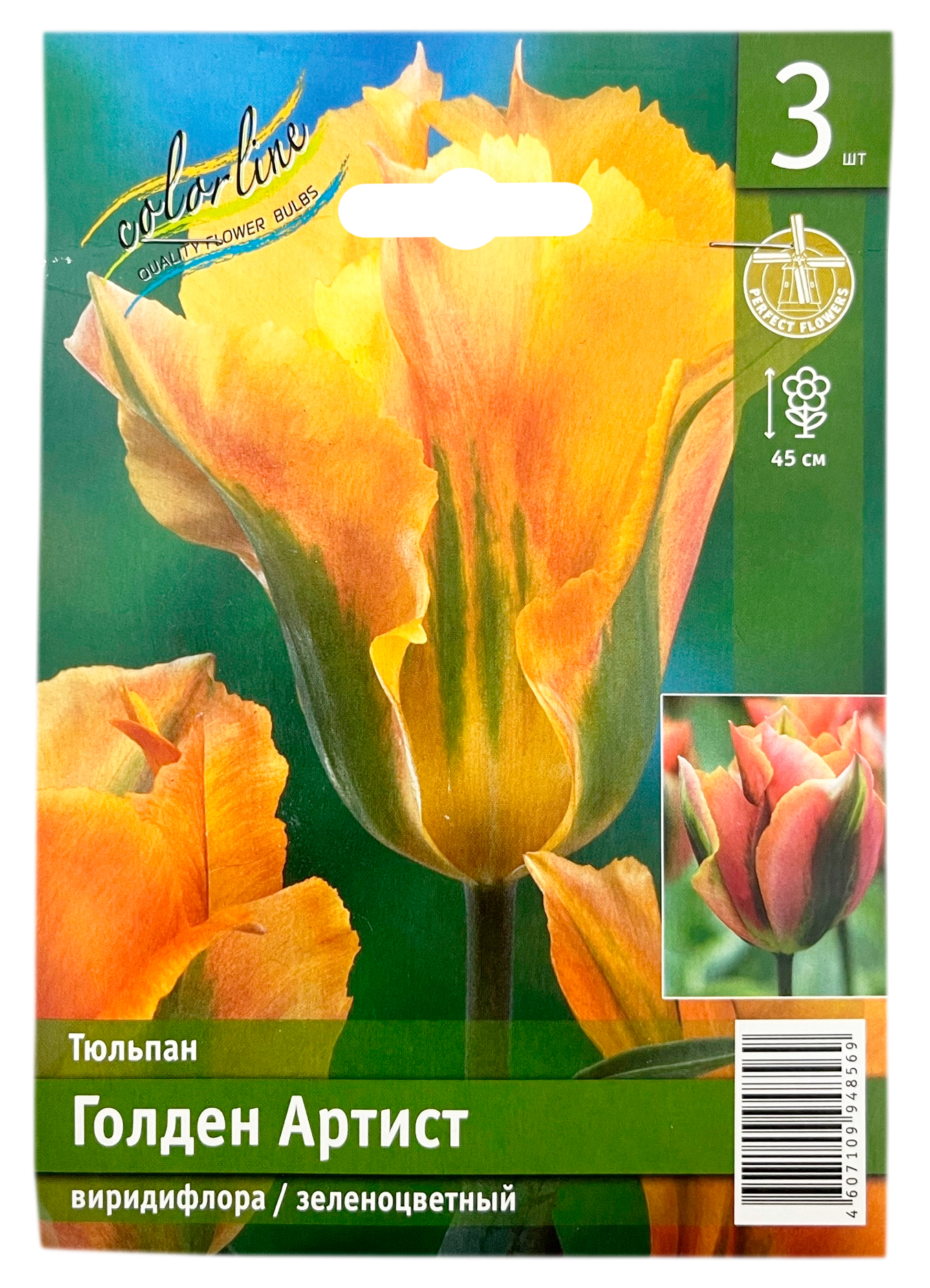 Тюльпан Голден АртистОтносится к зеленоцветным сортам тюльпанов (группа Виридифлора). Высота растения до 45 см. Цветок бокаловидный. Окрас цветка: лепесток нежно розовый, в центре насыщенно-зелёная полоса, по краю ярко жёлтая кайма. Высота бокала цветка до 10 см.