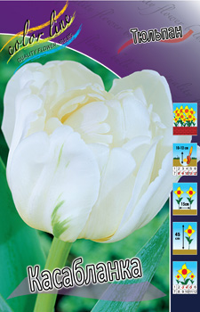 Тюльпан Касабланка относится к группе Махровые поздние, высота растения до 45 см, цветок густомахровый, напоминающий цветок пиона (пионовидный). Размер бутона 6-7 см в высоту и 8-10 см в диаметре. Окрас цветка кремовый. Посадка - август, сентябрь, октябрь. Глубина посадки зависит от размера луковицы и её определяют как 3 высоты луковицы, если считать от её донца, а густоту - как 2 диаметра луковицы. Период цветения - май - июнь. Почва - нейтральная или известково - кислая. Использование махровых тюльпанов: декоративные посадки, срезка, ускоренная выгонка. К достоинствам махровых поздних тюльпанов можно отнести долго не увядающие цветки, высокие крепкие цветоносы и сравнительно продолжительный период цветения, длящийся в среднем три недели.Характеристики