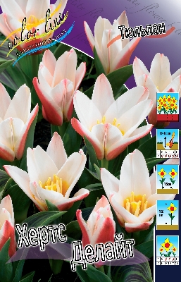 Тюльпан Хертс Делайт относится к группе Кауфмана. Высота растения 12 см. Формы цветка крупные, удлиненные, в полностью раскрытом состоянии - звездчатые. Окрас цветка внутри белый, снаружи красный с белой каймой, высота бокала цветка 7-9 см. Декоративная листва .Посадка - август, сентябрь, октябрь. Глубина посадки зависит от размера луковицы и составляет в среднем 8-10 см. Минимальное расстояние между луковицами должно вдвое превышать их диаметр.Тюльпаны Хертс Делайт- отличаются самыми ранними сроками цветения (иногда уже в начале апреля), устойчивостью к пестролепестности и небольшой высотой относится к среднепоздним. Почва - нейтральная или известково - кислая. По освещённости данные тюльпаны предпочитают безветренные солнечные места или полутень. Преимущества тюльпанов данной группы - цветы хорошо переносят весенние заморозки, устойчивы к вирусу пестролепестности, длительное время сохраняются в срезке. Используются тюльпаны Кауфмана, главным образом, для выращивания на альпийских горках, в рокариях.Характеристики