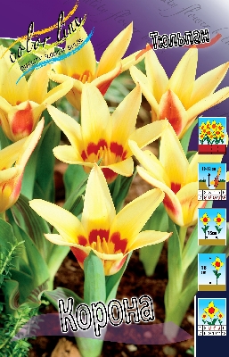 Тюльпан Корона относится к группе Кауфмана. Высота растения 18 см. Формы цветка крупные, удлиненные, в полностью раскрытом состоянии - звездчатые. Окрас цветка снаружи красный с кремово-желтой каймой, когда бокал открывается - внутри светло-желтый с розовой горловиной, высота бокала цветка 7-9 см. Декоротивная листва. Посадка - август, сентябрь, октябрь. Глубина посадки зависит от размера луковицы и составляет в среднем 8-10 см. Минимальное расстояние между луковицами должно вдвое превышать их диаметр.Тюльпаны Корона - отличаются самыми ранними сроками цветения (иногда уже в начале апреля), устойчивостью к пестролепестности и небольшой высотой относится к среднепоздним. Почва - нейтральная или известково - кислая. По освещённости данные тюльпаны предпочитают безветренные солнечные места или полутень. Преимущества тюльпанов данной группы - цветы хорошо переносят весенние заморозки, устойчивы к вирусу пестролепестности, длительное время сохраняются в срезке.Характеристики