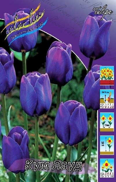 Тюльпан Kum Laud - зацветает поздно. Высота растения 60-70 см. Стебли толстые ипрочные. Листья темно-зеленые. Цветок бокаловидный, пурпурно-фиолетовый, с бронзовым отливом, в процессе цветения переходит в синевато-колокольчиково-фиолетовый, с серебристым отливом. Бокал крупный высотой около 9 см. Цветет в июне.Характеристики