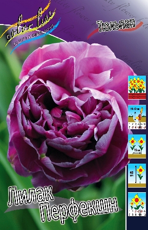 Тюльпан Лилак Перфекшн относится к группе Махровые поздние. Высота растения до 45 см. Цветок густомахровый, напоминающий цветок пиона (пионовидный). Размер бутона 6-7 см в высоту и 8-10 см в диаметре. Окрас цветка фиолетовый с белым переливом. Посадка - август, сентябрь, октябрь. Глубина посадки зависит от размера луковицы и её определяют как 3 высоты луковицы, если считать от её донца, а густоту - как 2 диаметра луковицы. Период цветения - май - июнь. Почва - нейтральная или известково - кислая. Использование махровых тюльпанов: декоративные посадки, срезка, ускоренная выгонка. К достоинствам махровых поздних тюльпанов можно отнести: долго не увядающие цветки, высокие крепкие цветоносы и сравнительно продолжительный период цветения, длящийся в среднем три недели.Характеристики