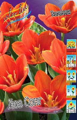 Тюльпан Лов Сонг относится к группе Кауфмана. Высота растения 15 см. Формы цветка крупные, удлиненные, в полностью раскрытом состоянии - звездчатые. Окрас цветка оранжево-алый, высота бокала цветка 7-9 см. Декоративная листва. Посадка - август, сентябрь, октябрь. Глубина посадки зависит от размера луковицы и составляет в среднем 8-10 см. Минимальное расстояние между луковицами должно вдвое превышать их диаметр.Тюльпаны Лов Сонг- отличаются самыми ранними сроками цветения (иногда уже в начале апреля), устойчивостью к пестролепестности и небольшой высотой относится к среднепоздним. Почва - нейтральная или известково - кислая. По освещённости данные тюльпаны предпочитают безветренные солнечные места или полутень. Преимущества тюльпанов данной группы - цветы хорошо переносят весенние заморозки, устойчивы к вирусу пестролепестности, длительное время сохраняются в срезке. Используются тюльпаны Кауфмана, главным образом, для выращивания на альпийских горках, в рокариях, для высадки в бордюрах и под деревьями.Характеристики