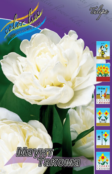 Тюльпан Маунт Такома относится к группе Махровые поздние. Высота растения до 40 см. Цветок густомахровый, напоминающий цветок пиона (пионовидный). Размер бутона 6-7 см в высоту и 8-10 см в диаметре. Окрас цветка белый. Посадка - август, сентябрь, октябрь. Глубина посадки зависит от размера луковицы и её определяют как 3 высоты луковицы, если считать от её донца, а густоту - как 2 диаметра луковицы. Период цветения - май - июнь. Почва - нейтральная или известково - кислая. Использование махровых тюльпанов: декоративные посадки, срезка, ускоренная выгонка. К достоинствам махровых поздних тюльпанов можно отнести: долго не увядающие цветки, высокие крепкие цветоносы и сравнительно продолжительный период цветения, длящийся в среднем три недели.Характеристики