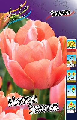 Тюльпан Ментон Экзотик относится к группе Махровые поздние. Высота растения до 45 см. Цветок густомахровый, напоминающий цветок пиона (пионовидный). Размер бутона 6-7 см в высоту и 8-10 см в диаметре. Окрас цветка лососевый. Посадка - август, сентябрь, октябрь. Глубина посадки зависит от размера луковицы и её определяют как 3 высоты луковицы, если считать от её донца, а густоту - как 2 диаметра луковицы. Период цветения - май - июнь. Почва - нейтральная или известково - кислая. Использование махровых тюльпанов: декоративные посадки, срезка, ускоренная выгонка. К достоинствам махровых поздних тюльпанов можно отнести: долго не увядающие цветки, высокие крепкие цветоносы и сравнительно продолжительный период цветения, длящийся в среднем три недели.Характеристики