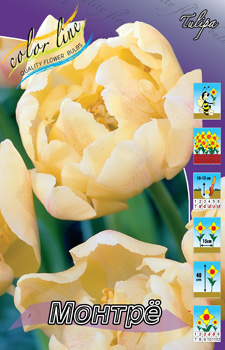 Тюльпан махровый ранний MONTREUX относится к группе махровых раноцветущих тюльпанов. Цветки у этого сорта желтого цвета. Основу группы махровых раноцветущих тюльпанов составляют низкорослые (20—25 см) тюльпаны с относительно небольшими (5—7 см) махровыми цветкам широко раскрытой формы. Махровые ранние тюльпаны цветут раньше поздних высокорослых сортов, но позже тюльпанов Грейга, Фостера и других ботанических раноцветущих видов.Характеристики