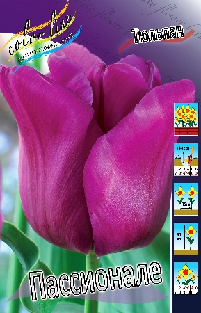 Тюльпан Пассионале относится к группе Триумф. Высота растения до 50 см. Цветок бокаловидный, крупный. Окраска цветка: темно-сиреневая. Высота бокала цветка до 10 см. Посадка - август, сентябрь, октябрь. Глубина посадки зависит от размера луковицы и составляет в среднем 8-12 см. Минимальное расстояние между луковицами должно вдвое превышать их диаметр. Период цветения - апрель - май. Почва - нейтральная или известково - кислая. Тюльпаны Триумф универсальны, их используют для срезки, для выгонки, для украшения парков и садов. Недостаток тюльпанов группы Триумф: слабая сопротивляемость многих сортов вирусу пестролепестности.Характеристики