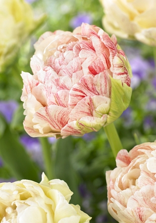 Тюльпан Писте относится к группе Махровые ранние. Цветы этой группы имеют большое количество лепестков, высота растения до 45 см, цветок формой и величиной напоминает густомахровый пион. Размер бутона 6 см в высоту и 8-10 см в диаметре. Окрас кремовый с ярко-малиновым постепенно проявляющимся меланжем. Посадка - август, сентябрь, октябрь. Глубина посадки зависит от размера луковицы и её определяют как 3 высоты луковицы, если считать от её донца, а густоту - как 2 диаметра луковицы. Период цветения апрель-май. Используют махровые ранние тюльпаны в качестве горшечной культуры, для выгонки и декоративных посадках на переднем плане. В солнечную погоду цветы широко раскрываются, а после сильного дождя слишком тяжелые цветки могут клониться к земле. Недостатком махровых ранних тюльпанов является невысокий коэффициент размножения.Характеристики