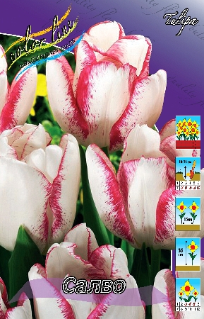 Тюльпан Салво относится к группе Триумф. Очень изящные, крупные-высотой до 8 см белые бутоны, имеющие по краям лепестков насыщенную ярко-малиновую кайму, переходящую в малиновую штриховку. Цветонос высотой до 45 см. Посадка - август, сентябрь, октябрь. Глубина посадки зависит от размера луковицы и составляет в среднем 8-12 см. Минимальное расстояние между луковицами должно вдвое превышать их диаметр. Период цветения - апрель - май. Почва - нейтральная или известково - кислая. Тюльпаны Триумф универсальны, их используют для срезки, для выгонки, для украшения парков и садов. Недостаток тюльпанов группы Триумф: слабая сопротивляемость многих сортов вирусу пестролепестности.Характеристики