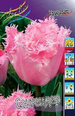 Тюльпан Сантендер относится к группе густо - бахромчатых, высота растения до 50 см, цветок бокаловидный, крупный. Окрас цветка розово-сиреневый с белым основанием, высота бокала цветка 7-9 см. Бахрома густая, длинная. Посадка - август, сентябрь, октябрь. Глубина посадки зависит от размера луковицы и составляет в среднем 8 - 12 см. Минимальное расстояние между луковицами должно вдвое превышать их диаметр. Период цветения - апрель - май. Почва - нейтральная или известково - кислая. Сорт универсального назначения. Сфера использования - ландшафтный дизайн, домашние декорации.Характеристики