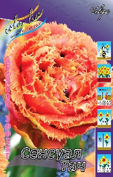 Тюльпан Сенсуал Тач относится к группе супер-тюльпанов "Двойной Эффект". Этот тюльпан сочетает в себе сразу несколько признаков: бахромчатый и махровый. Высота растения достигает 55 см. Цветок густомахровый, напоминающий цветок пиона (пионовидный). Окраска цветка: оранжево-красная с желтой бахромой. Высота бокала 8-10 см. Посадка август, сентябрь, октябрь. Глубина посадки зависит от размера луковицы и составляет в среднем 8-12 см. Минимальное расстояние между луковицами должно вдвое превышать их диаметр. Период цветения - апрель-май. Почва - нейтральная или известково-кислая. Сорт идеален для выращивания в открытом грунте. Сфера использования - ландшафтный дизайн, домашние декорации.Характеристики