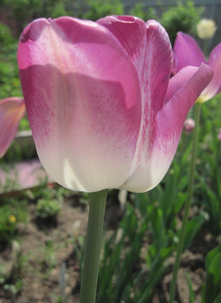 Тюльпан ШиунТюльпан Шиун относится к группе Триумф. Цветонос высотой 55 см. Цветок бокаловидный, крупный, чисто-белый с темно-фиолетовым краем. Высота бокала цветка до 8-10 см. Посадка - август, сентябрь, октябрь. Глубина посадки зависит от размера луковицы и составляет в среднем 8-12 см. Минимальное расстояние между луковицами должно вдвое превышать их диаметр. Период цветения - апрель - май. Почва - нейтральная или известково - кислая. Тюльпаны Триумф универсальны, их используют для срезки, для выгонки, для украшения парков и садов. Недостаток тюльпанов группы Триумф: слабая сопротивляемость многих сортов вирусу пестролепестности.