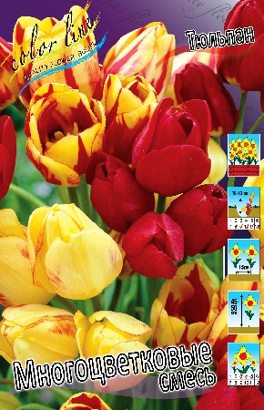 Тюльпан Многоцветные смесь относится к группе Многоцветковые, высота растения 45- 50 см, цветки имеют бокаловидные бутоны с немного заостренными лепестками, высота бокалов 6-8 см. Посадка - август, сентябрь, октябрь. Глубина посадки зависит от размера луковицы и составляет в среднем 8-12 см. Минимальное расстояние между луковицами должно вдвое превышать их диаметр. Период цветения: конец апреля - начало мая. Почва нужна плодородная, рыхлая, хорошо дренированная, умеренно увлажненная с нейтральной или щелочной реакцией. Сорт универсального назначения. Сфера использования - подходит как для озеленения и украшения клумб, так и для букетов, отлично растет на хорошо освещенном месте и в полутени. Элегантный букет на одном стебле.Характеристики