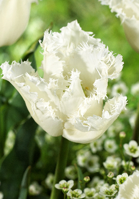 Тюльпан Смирнофф относится к группе Бахромчатые. Высота растения до 45 см. Цветок бокаловидный, крупный. Окрас цветка белоснежный, высота бокала цветка 7-9 см. Бахрома густая, длинная, почти белая. Посадка - август, сентябрь, октябрь. Глубина посадки зависит от размера луковицы и составляет в среднем 8 - 12 см. Минимальное расстояние между луковицами должно вдвое превышать их диаметр. Период цветения - апрель - май. Почва - нейтральная или известково - кислая. Сорт универсального назначения. Сфера использования - ландшафтный дизайн, домашние декорации.Характеристики