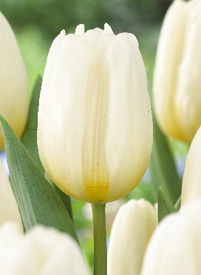 Тюльпан Сноу Маунтейн относится к группе Триумф, высота растения до 45 см, цветок бокаловидный, крупный. Окраска цветка белый с кремовым основанием бокала, высота бокала цветка до 7-8 см. Посадка - август, сентябрь, октябрь. Глубина посадки зависит от размера луковицы и составляет в среднем 8-12 см. Минимальное расстояние между луковицами должно вдвое превышать их диаметр. Период цветения - апрель - май. Почва - нейтральная или известково - кислая. Тюльпаны Триумф универсальны, их используют для срезки, для выгонки, для украшения парков и садов. Недостаток тюльпанов группы Триумф: слабая сопротивляемость многих сортов вирусу пестролепестности.Характеристики