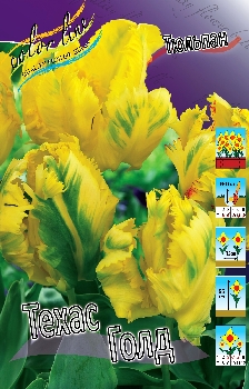 Тюльпан Техас Голд относится к группе Попугайные, высота растения 55 см. Форма цветка тюльпанов, широко раскрытая, не махровая, края лепестков сильно изрезаны, напоминающие растрепанные птичьи перья. Окрас цветка жёлтый с зелёными перьями, размер цветка до 20 см в диаметре. Посадка конец сентября - октябрь. Глубина посадки зависит от размера луковицы и составляет в среднем 8-12 см. Минимальное расстояние между луковицами должно вдвое превышать их диаметр. Место посадки лучше менять 1 раз в 4-5 лет. Устойчивый, здоровый сорт, продолжительность цветения - от 8-10 дней. Период цветения - май - июнь. Почва - рыхлая, хорошо дренированная с нейтральной или слабощелочной реакцией. Сорт универсального назначения, подходит для срезки. Высаживаются попугайные тюльпаны, как правило, отдельно от остальных тюльпанов, на переднем плане, чтобы в полной мере оценить их необычную внешность.Характеристики