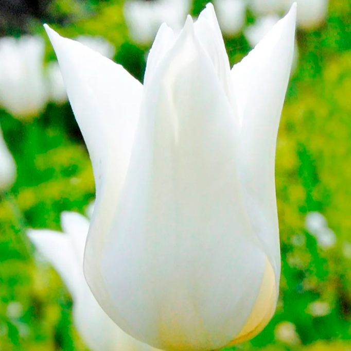 Тюльпан Уайт Триумфатор относится к группе Лилиецветные. Высота растения 45 см. Цветок этих тюльпанов имеют необычную лилейную форму - удлиненные, узкие лепестки с заостренными кончиками, отогнутыми наружу. Окрас цветка белый, высота бокала цветка 8-10 см. Устойчивый, здоровый сорт, продолжительность цветения - от 8-10 дней. Посадка - август, сентябрь, октябрь. Глубина посадки зависит от размера луковицы и составляет в среднем 8-12 см. Минимальное расстояние между луковицами должно вдвое превышать их диаметр. Период цветения - апрель - май. Предпочитают плодородную водопроницаемую почву с большим содержанием песка и плохо переносят переувлажнение. Лилиецветные тюльпаны любят солнечные места, однако хорошо растут и в полутени. Сорт универсального назначения. Великолепный выбор для миксбордеров, клумб и срезки.Характеристики