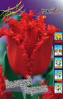 Тюльпан Валерий Гергиев относится к группе густо - бахромчатых, высота растения до 45 см, цветок бокаловидный, крупный. Окраска цветка ярко-красный, бахрома включает жёлтые вкрапления, высота бокала цветка 7-9 см. Бахрома густая, длинная. Посадка - август, сентябрь, октябрь. Глубина посадки зависит от размера луковицы и составляет в среднем 8 - 12 см. Минимальное расстояние между луковицами должно вдвое превышать их диаметр. Период цветения - апрель - май. Почва - нейтральная или известково - кислая. Сорт универсального назначения. Сфера использования - ландшафтный дизайн, домашние декорации.Характеристики