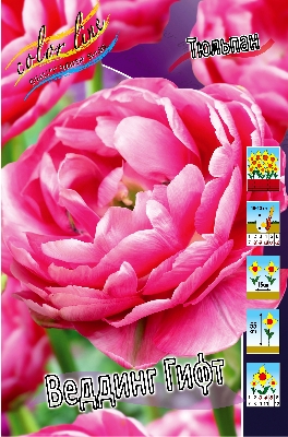 Тюльпан Веддинг Гифт относится к группе Махровые поздние. Высота растения 55 см. Цветок густомахровый, напоминающий цветок пиона (пионовидный). Размер бутона 6-7 см в высоту и 8-10 см в диаметре. Окрас цветка ярко-розовый с белыми подпалинами. Посадка - август, сентябрь, октябрь. Глубина посадки зависит от размера луковицы и её определяют как 3 высоты луковицы, если считать от её донца, а густоту - как 2 диаметра луковицы. Период цветения - май - июнь. Почва - нейтральная или известково - кислая. Использование махровых тюльпанов: декоративные посадки, срезка, ускоренная выгонка. К достоинствам махровых поздних тюльпанов можно отнести: долго не увядающие цветки, высокие крепкие цветоносы и сравнительно продолжительный период цветения, длящийся в среднем три недели.Характеристики