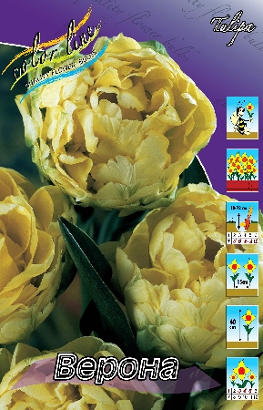 Тюльпан Верона относится к группе Махровые ранние. Цветы этой группы имеют большое количество лепестков, высота растения до 40 см, цветок формой и величиной напоминает густомахровый пион. Размер бутона 6 см в высоту и 8-10 см в диаметре. Окрас цветка жёлтый. Посадка - август, сентябрь, октябрь. Глубина посадки зависит от размера луковицы и её определяют как 3 высоты луковицы, если считать от её донца, а густоту - как 2 диаметра луковицы. Период цветения апрель-май. Используют махровые ранние тюльпаны в качестве горшечной культуры, для выгонки и декоративных посадках на переднем плане. В солнечную погоду цветы широко раскрываются, а после сильного дождя слишком тяжелые цветки могут клониться к земле. Недостатком махровых ранних тюльпанов является невысокий коэффициент размножения.Характеристики