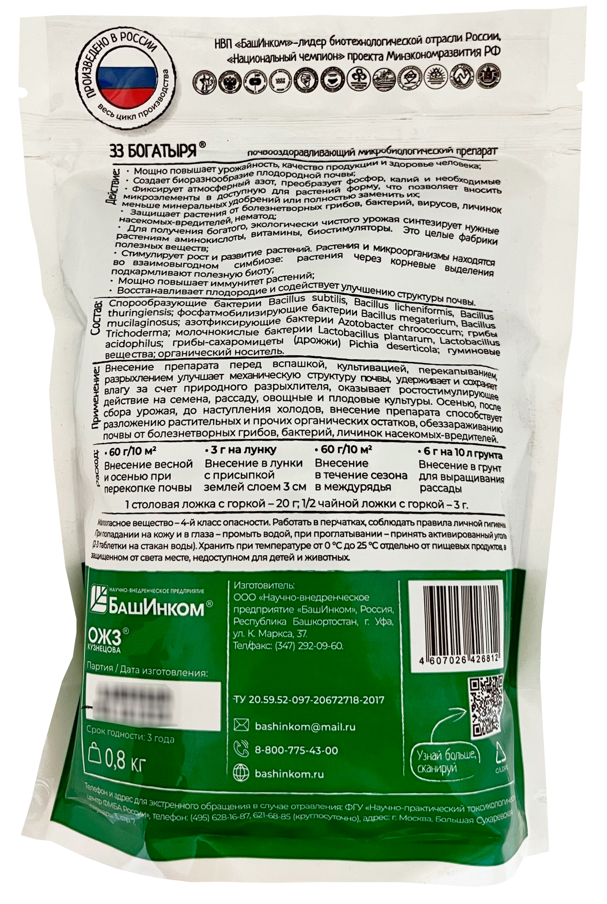 33 Богатыря гранулированный- микробиологический препарат 0,8кгУникальный почвооздоравливающий, оживляющий, восстанавливающий плодородие почвы микробиологический препарат. Он содержит 33 штамма полезных почвенных микроорганизмов на органическом носителе в форме гранул.