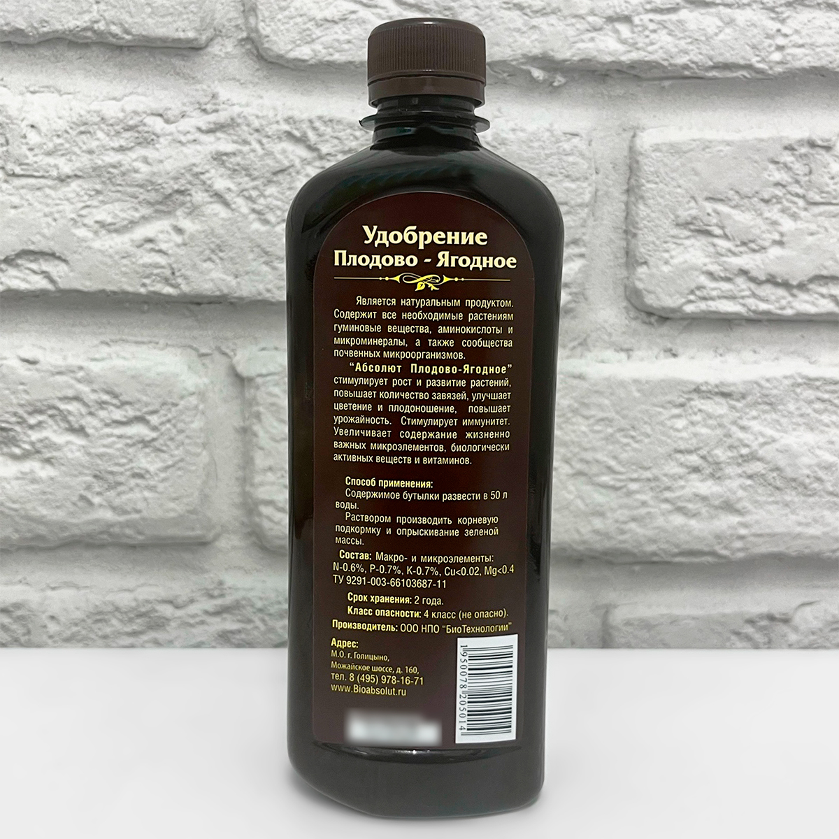 Удобрение плодово-ягодное АБСОЛЮТ 500млНатуральные природные технологии. Является натуральным продуктом. Содержит все необходимые растениям гуминовые вещества, аминокислоты и микроминералы, а также сообщества почвенных микроорганизмов.