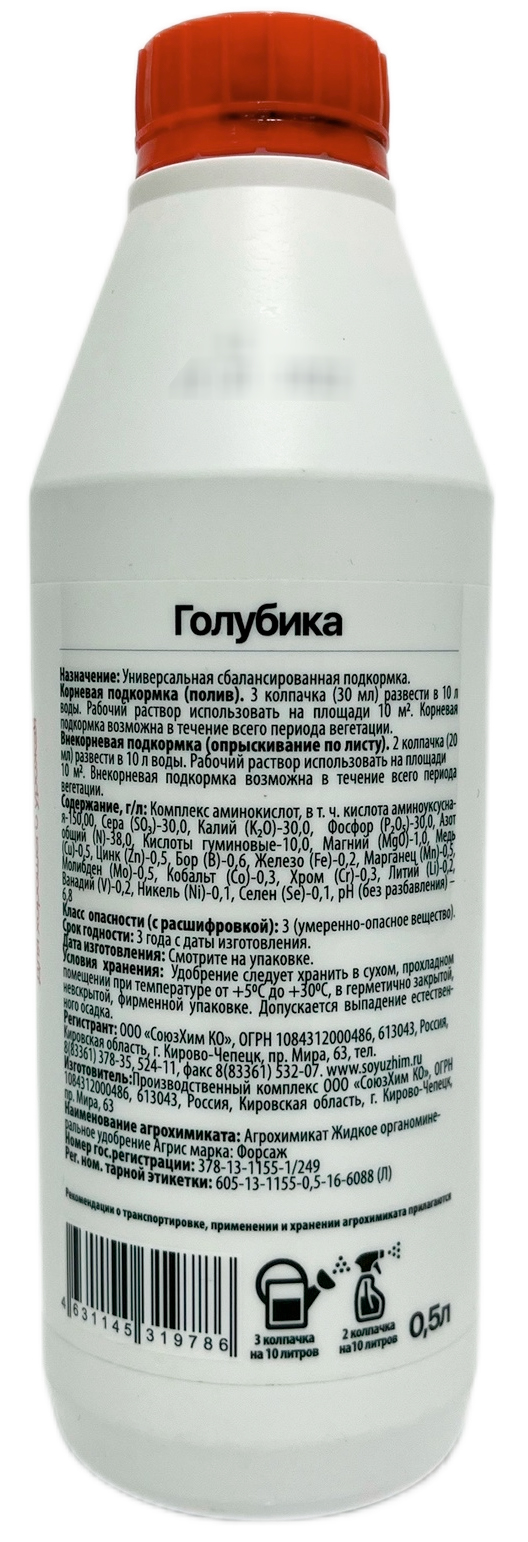 Agrees ГОЛУБИКАЖидкое органическое удобрение содержит: микроэлементы, аминокислоты, гуминовые кислоты. Сбалансированная подкормка для хорошего урожая.